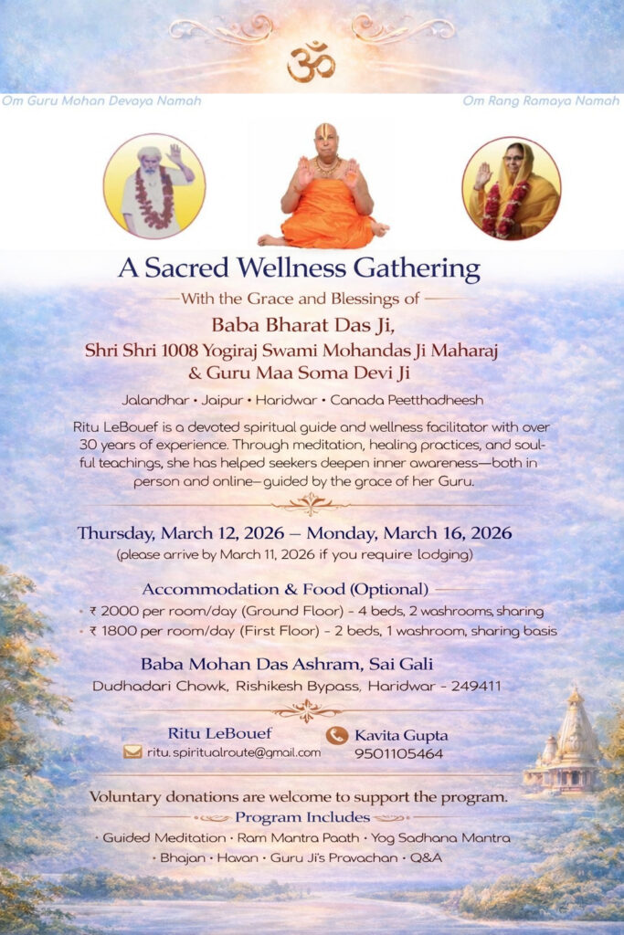 Sacred Wellness Gathering at Haridwar (India) Ashram March 12-March 16, 2026,organised by Ritu LeBouef